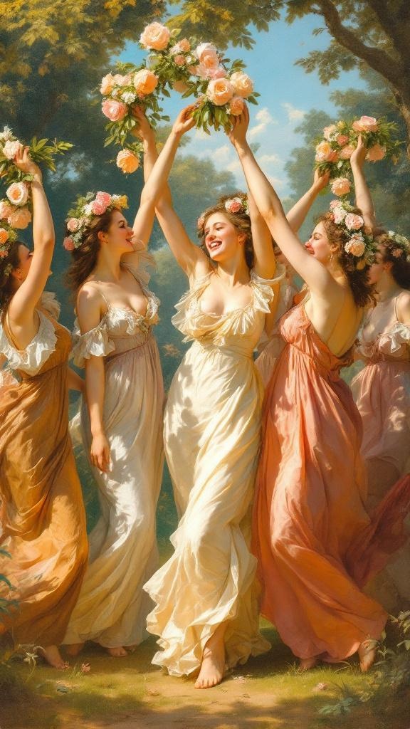 A group of beautiful young women in flowing pastel silk dresses dancing and laughing in a sunlit garden, holding garlands of flowers above their heads, their hair adorned with roses, painted in the lush romantic style of 18th century Rococo oil painting with soft golden light, rich warm colors of cream peach and rose, visible brushwork, classical composition with trees and blue sky in the background, 8k