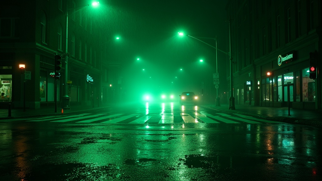 A rainy city crosswalk at night, the green traffic signal spilling out of the lens as a thick translucent ribbon of light that runs across the asphalt like a glass river, soft green reflections stretching through puddles, saturated vivid green highlights pulsing along the wet street markings, deep forest storefront shadows on both sides, familiar urban scene transformed by impossible physics, cinematic realism, ultra-detailed