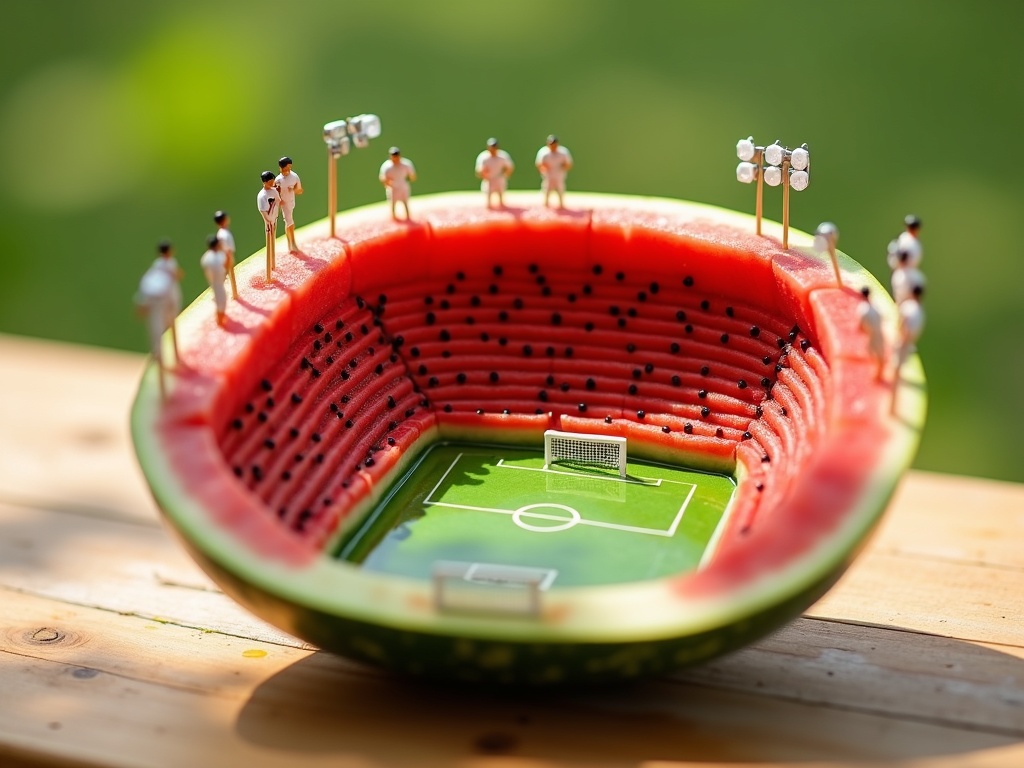 A watermelon cut in half on a summer picnic table outdoors, the red fruit interior is a detailed miniature football stadium — tiny spectators sitting on the black seeds as stadium seats, a green field carved into the flesh, miniature floodlights on toothpick poles, the white rind acting as concrete stadium walls, a tiny scoreboard showing 2:1, watermelon juice pooling at the base like rain puddles on the field, outdoor summer light, macro tilt-shift, 8k