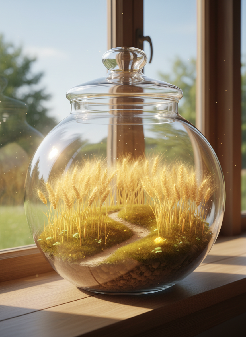 A large glass jar on a windowsill containing a miniature field of soft yellow wheat and lemon-yellow light, tiny paths winding through the landscape inside the vessel, clean daylight, detailed reflections, magical realism