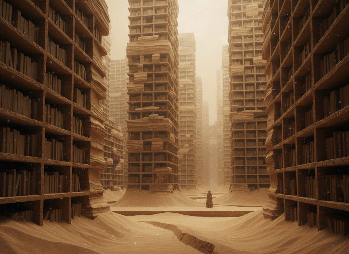 An endless archive room where every shelf is built from compacted brown sand blocks, fine dust lifting in the air, monumental stillness, surreal architecture