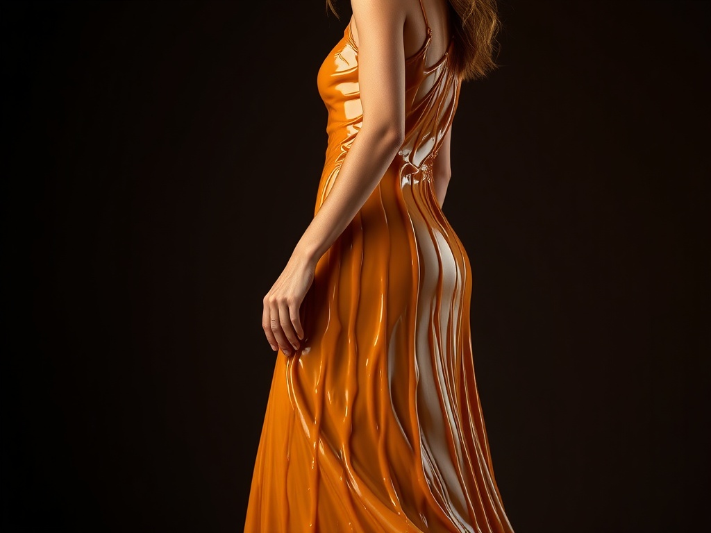 A close fashion portrait of a woman in a floor-length gown made of dripping liquid caramel, the sticky golden-brown material stretching and pulling as she turns, warm studio light catching every glossy strand, dark chocolate background, haute couture meets confectionery, 8k