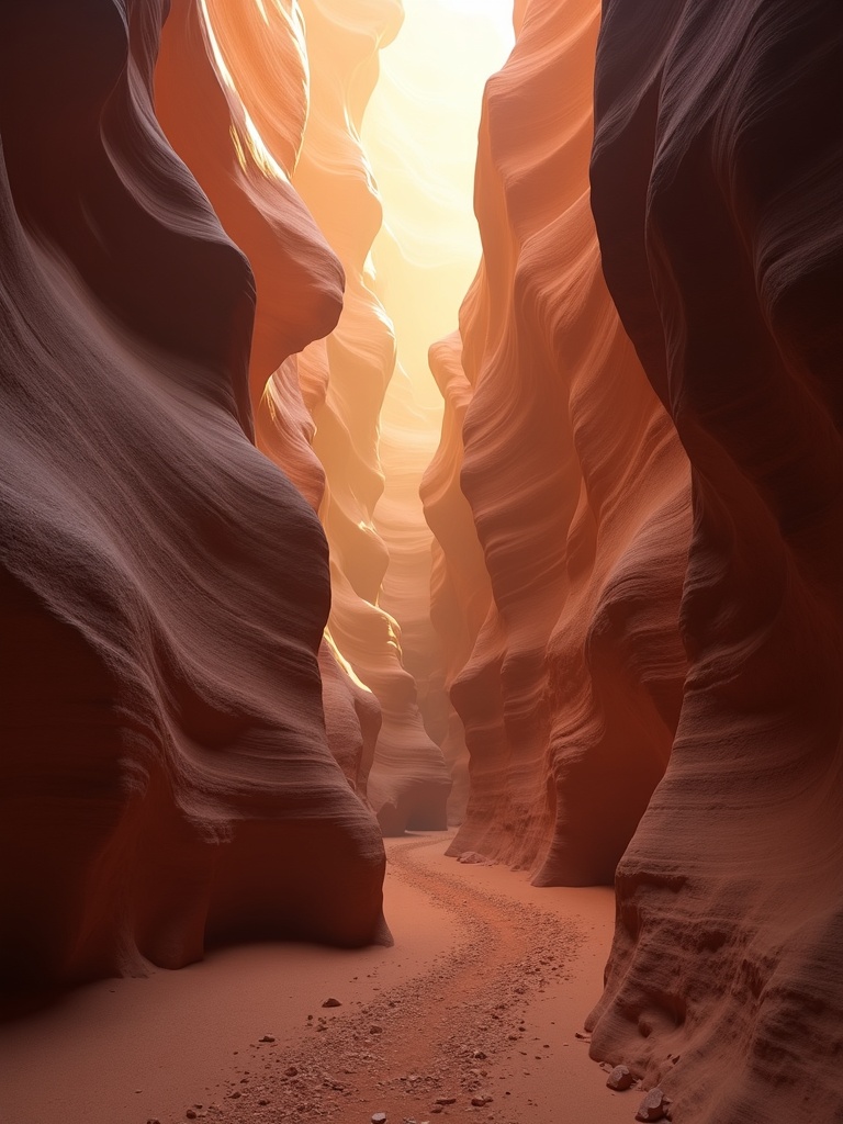 A canyon whose cliffs fold like heavy brown velvet instead of rock, one narrow path through the center, low golden light, impossible landscape realism