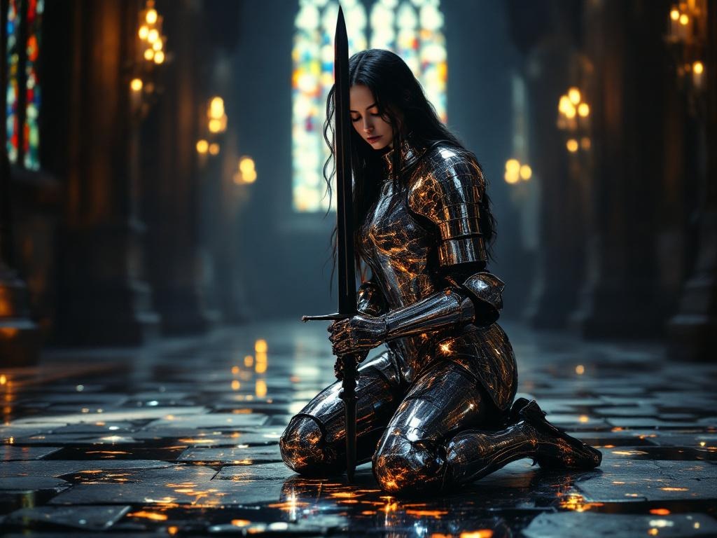 Alone female knight kneeling in a dark cathedral, her full plate armor made entirely of mirrored glass, every surface reflecting the stained glass windows and candlelight around her in fractured colored fragments, she holds a black iron sword point down into the stone floor, her face bare and serene with closed eyes, long dark hair falling over the mirror shoulders, the reflections creating a kaleidoscope of warm amber and deep crimson across the floor, dramatic chiaroscuro lighting, cinematic, 8k