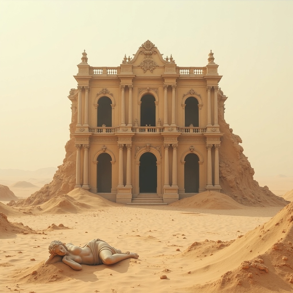 A crumbling baroque palace standing alone in an endless flat desert, the ornate facade still partially intact with broken columns, collapsed balconies, and empty arched windows filled with drifting sand, the stone weathered to a warm light coffee and soft mocha tone, fine brown desert sand piled against the walls and spilling through doorways, the sky a muted dusty beige brown haze with no sun visible, the color palette entirely in shades of espresso brown warm latte pale sand and muted cream, the atmosphere quiet and still as if centuries have passed, distant sand dunes stretching to the horizon in soft coffee brown gradients, a single cracked marble statue of a woman lying face down in the sand near the entrance half buried, cinematic wide shot, muted desaturated tones, 8k