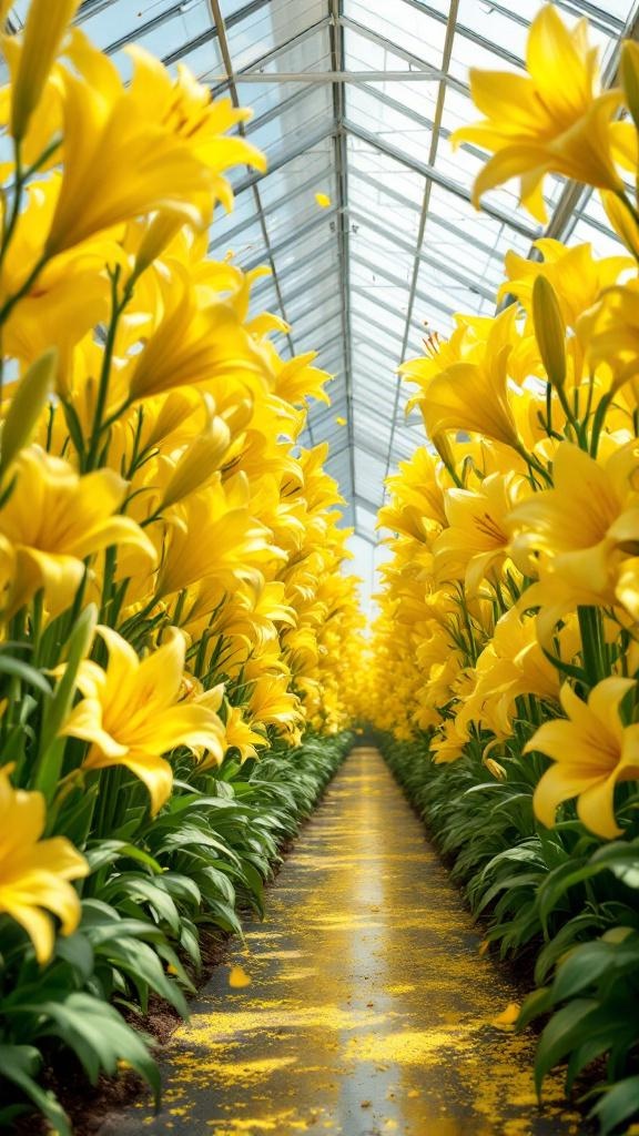 A long greenhouse aisle filled with towering lemon-yellow lilies, the flowers rising above head height and bending over the path, yellow pollen floating in the air, glass reflections, rich environment, ultra-detailed