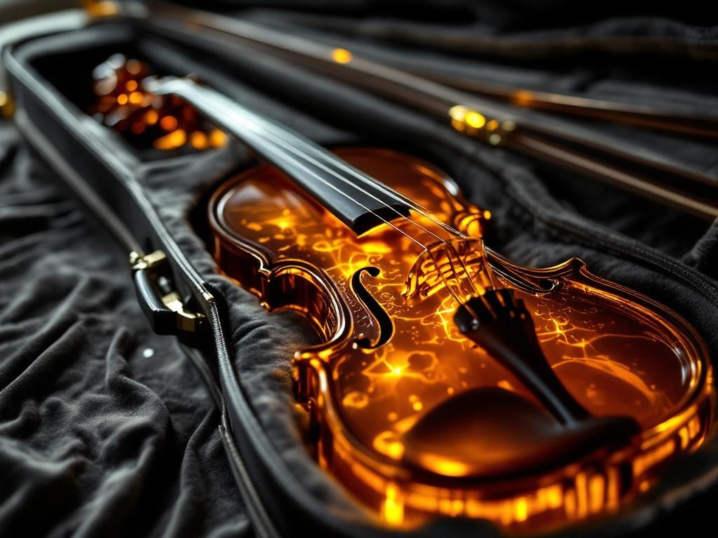 A violin resting in its open velvet-lined case, but the instrument is made of transparent amber caramel — the curved body shows air bubbles trapped in the golden-brown sugar glass, strings made of thin stretched caramel threads, warm light passing through the translucent body creating honey-colored projections on the dark velvet beneath, one corner of the scroll slightly softening and beginning to droop from the warmth, 8k