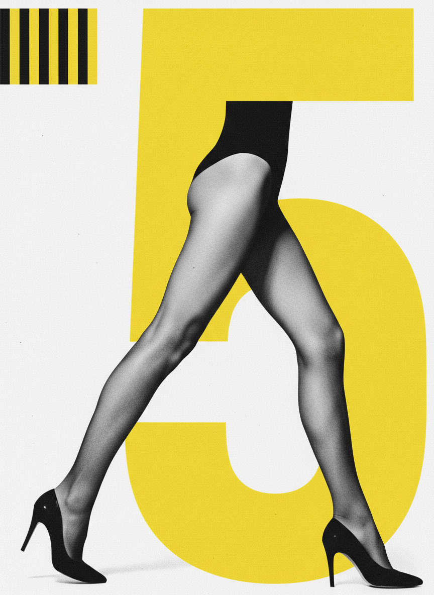 A bold modernist fashion poster in black white and bright yellow, a high-contrast photograph of a womans legs from mid-thigh down wearing elegant black stiletto heels and sheer black stockings, stepping forward with one foot, overlaid with a massive bold yellow sans-serif number 5 filling the right side of the frame, the background crisp white with subtle grain texture, additional thin black and yellow vertical stripes as a graphic element in the upper left, the overall aesthetic referencing mid-century European fashion advertising and Swiss graphic design, high contrast editorial print design, 8k