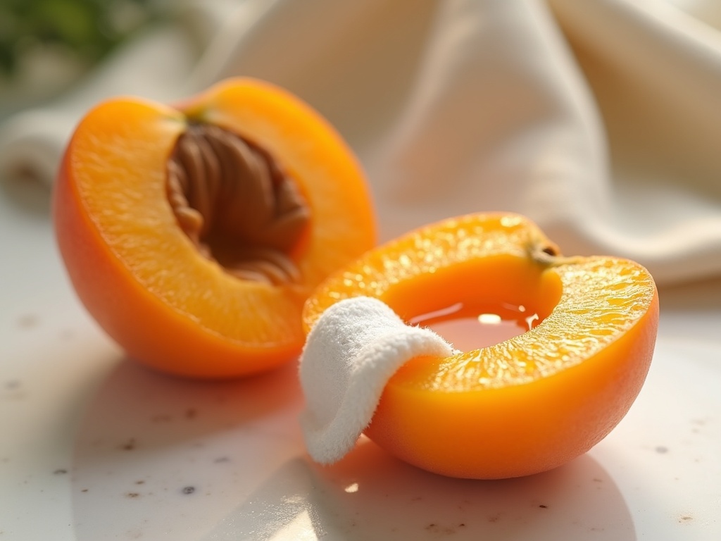 A ripe apricot cut in half on a marble surface, the pit removed, the cavity has become a miniature ancient Roman bath — warm apricot-tinted water filling the tiny stone pool, miniature columns carved from the fruit flesh around the edge, gentle steam rising in the warm air, a miniature white towel draped over the golden rim, the other apricot half sitting beside it showing its sunny interior, macro photography, bright light, 8k