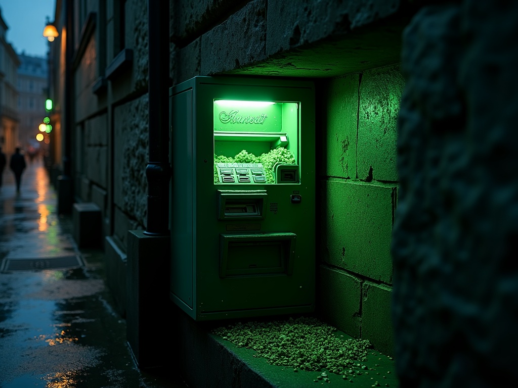 A cash machine set into a stone wall on a wet evening street, instead of banknotes it dispenses thin translucent leaves and glowing green mineral chips, roots visible beneath the cracked screen, mint reflections sliding over the keypad, vivid green light pooling on the pavement, deep forest shadow inside the alcove, an everyday financial object turned into a strange living vault, cinematic, hyper-detailed