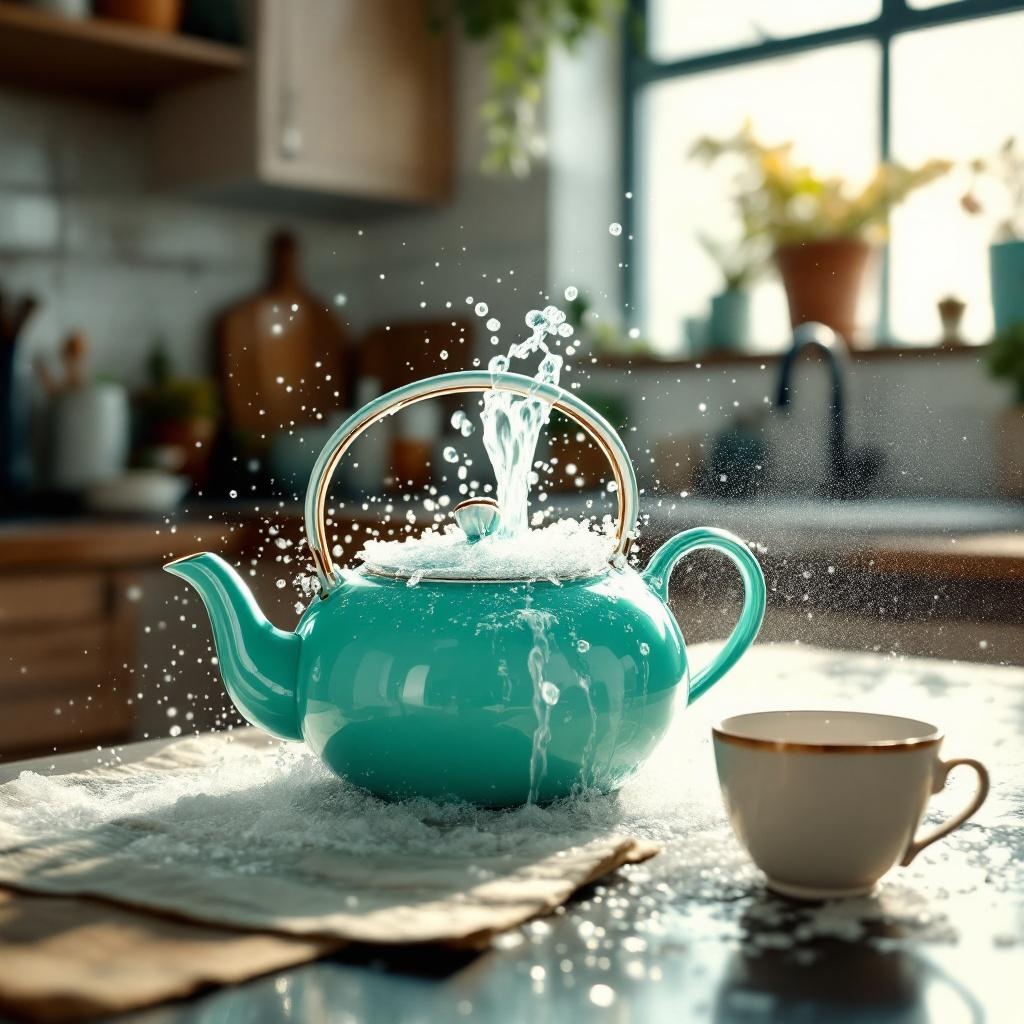 A ceramic turquoise teapot sitting on a kitchen counter, its spout pouring an impossibly huge turquoise waterfall — crystal-clear teal water cascading off the counter edge in a wide powerful stream like a miniature Niagara, fine mist rising from the impact on the floor below, the stream far more water than the teapot could possibly hold, a dry teacup sitting nearby waiting for its turn, afternoon kitchen light, 8k