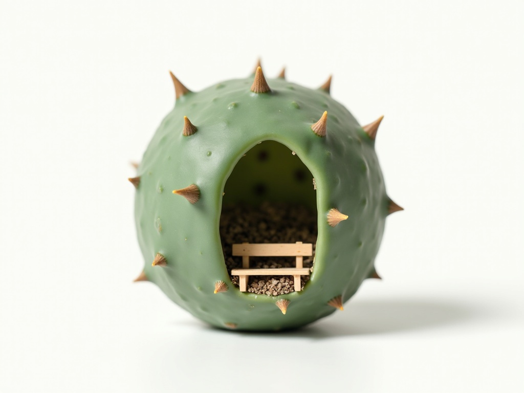 A perfectly spherical cactus with tiny thorns and subtle leaves, a miniature wooden bench embedded in its center like a hidden park, clean white studio backdrop, surreal object design, crisp shadows