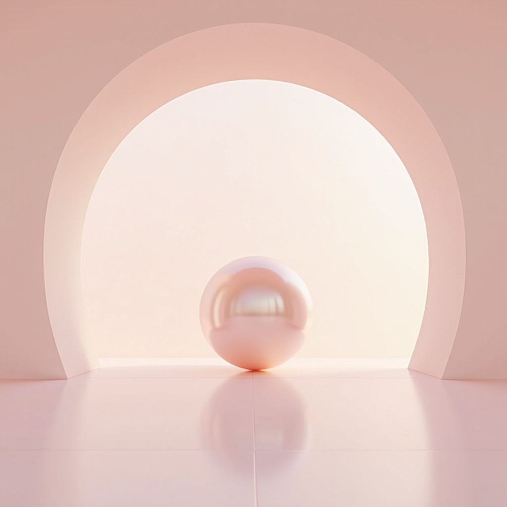 A quiet observatory with a giant suspended blush pearl aligned with the telescope, pastel light pink dome, authentic pink reflections on the polished floor, minimal impossible architecture, sharp focus