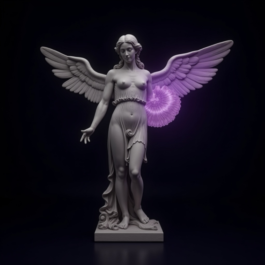 A classical marble winged statue with one wing intact and the other wing transforming into amethyst light panels, violet scan traces, a restrained lavender halo around the silhouette, black museum void, fine-art realism