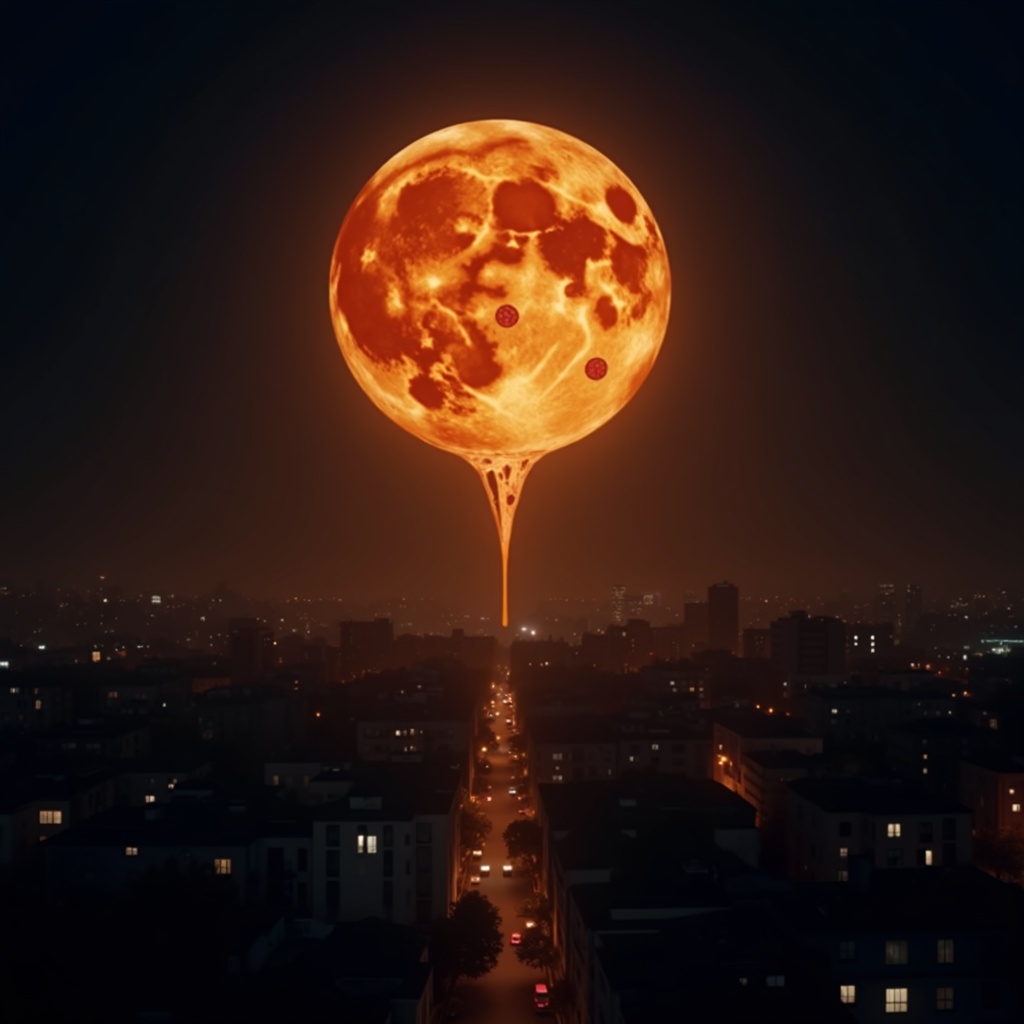 A night cityscape where the full moon in the sky is actually a giant pepperoni pizza — golden melted cheese glowing like moonlight, pepperoni circles clearly visible, a thin string of cheese stretching down toward the skyline, the warm orange glow of the pizza-moon casting light on rooftops and streets below, city lights reflecting off windows, cinematic night photography, 8k