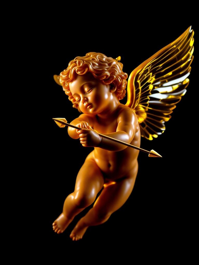 A classical Baroque cupid sculpture frozen mid flight against a pure black background, carved from translucent amber glass, warm honey orange material catching dramatic side light, semi transparent wings with visible internal stress fractures glowing golden at the edges, the cherub face detailed and serene with closed eyes, a gilded arrow drawn in the bow, the entire figure emitting a warm inner amber luminescence, fine art photography, 8k
