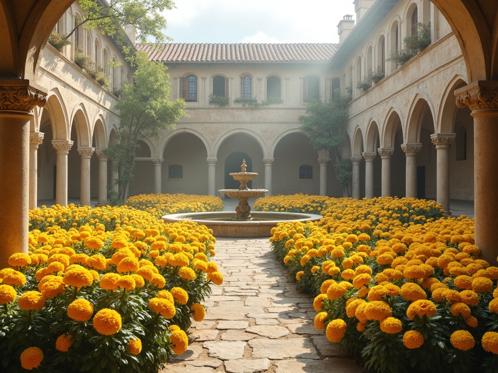 A quiet monastery courtyard transformed into a vast garden of pale yellow, natural yellow, and canary-yellow marigolds, dense rows of flowers surrounding a stone fountain and cloister walkways, pale limestone arches, still morning air, soft haze above the blossoms, immersive environment, contemplative mood, richly textured, realistic, detailed, sharp focus