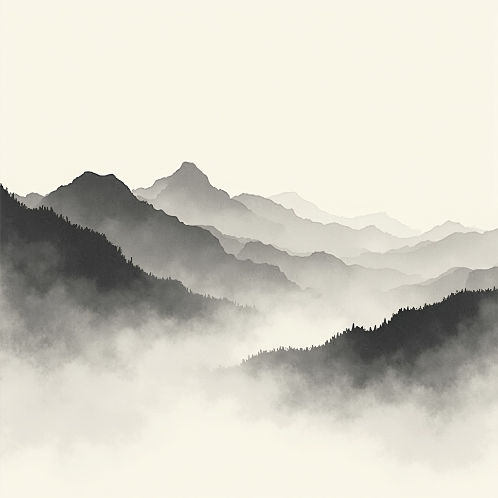 Layered monochrome mountain range painted in refined East Asian ink wash style, mist-filled valleys, elegant brush gradients, pale paper background, serene composition, museum-quality minimalism