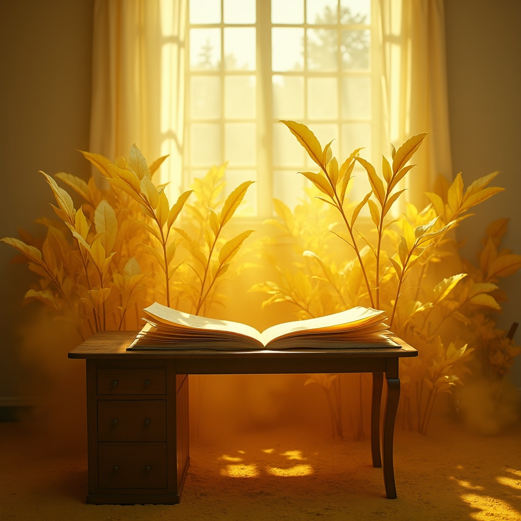A vintage writing desk in a sunlit studio, stacks of pale yellow paper curling upward like petals and growing into a full indoor garden of yellow leaves, soft yellow dust in the air, layered environment, surreal realism, sharp focus