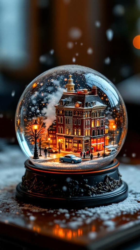 Close-up of a classic snow globe sitting on a mantelpiece, but inside it is not a toy — it is a hyper-realistic miniature city block under actual snowfall, tiny cars with working headlights driving on wet streets, pedestrians with umbrellas, steam rising from a manhole cover, streetlamps glowing orange, the curved glass distorting the edges, real water and snowflakes swirling inside, the cheap plastic base contrasting the living city within, warm fireplace light on the globe surface, 8k
