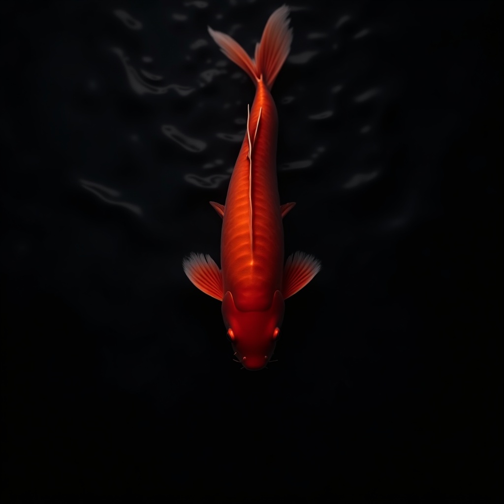 Top-view cinematic image of a single cherry-red koi fish gliding through near-black water with subtle ripples and glowing reflections, minimalist composition, refined luxury mood, rich scarlet tones dominating the subject and reflections, calm but dramatic atmosphere, ultra-detailed scales, premium poster-like aesthetic