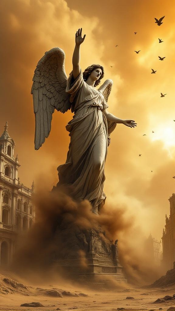 A towering marble angel statue in the center of an abandoned city square, its wings broken and one arm missing, being slowly swallowed by a river of warm copper brown sand flooding through the streets, thick dust laden air glowing amber from an invisible sun, the angels remaining outstretched hand reaching upward as the sand level rises past its waist, crumbling baroque buildings on either side half consumed by dunes, a flock of birds flying away in silhouette against the orange brown sky, the atmosphere heavy and suffocating, apocalyptic, cinematic, 8k