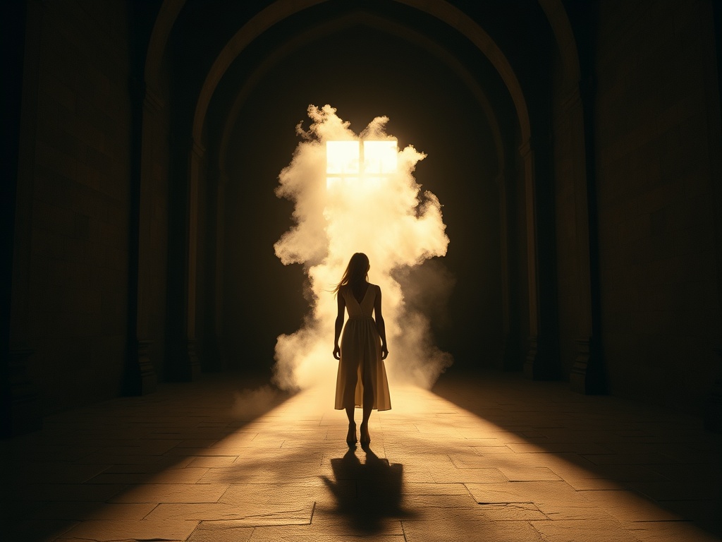 A lone woman standing in a vast brown stone hall, a suspended ring of soft dust behind her head, warm light, deep chocolate shadows, cinematic hero image
