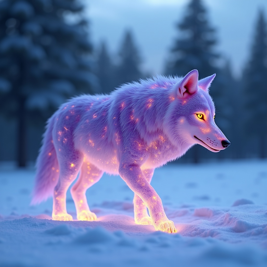 A wolf composed of layered violet quartz walking across fresh snow under a dim sky, bright lemon-yellow fractures glowing intensely between the crystal plates, golden yellow eyes blazing, warm yellow light casting on the snow beneath its paws, pine forest at the edge of the clearing, tactile photorealism, 8k