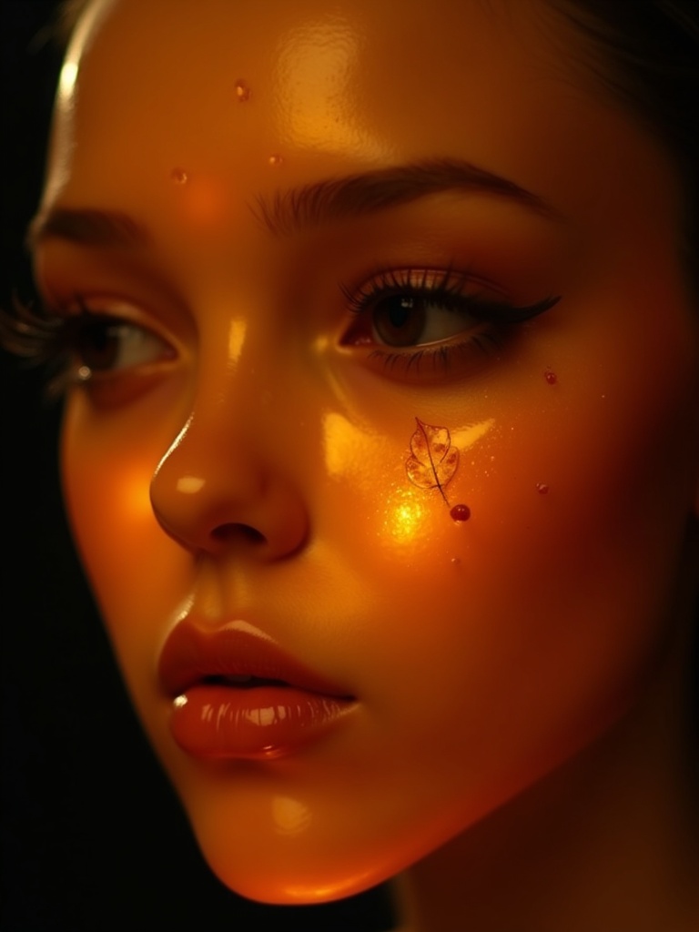 Extreme close up of a face wearing a smooth mask carved from translucent amber, warm honey orange mask covering from forehead to upper lip, dark eyes looking calmly through almond shaped openings, tiny prehistoric air bubbles and a small ancient leaf trapped inside the amber visible near the cheekbone, warm light passing through the mask creating a tangerine glow on the skin beneath, dark background, dramatic lighting, 8k
