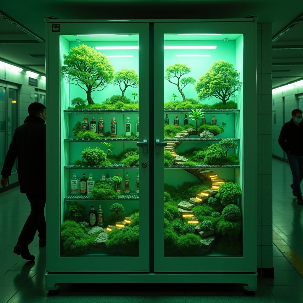 An automatic vending machine in a subway passage, but behind the glass each product slot contains a different miniature green ecosystem: moss stairways, jade reservoirs, tiny glowing trees, and misty mint canopies arranged where drinks should be, commuters reflected across the glass door, soft green light illuminating the tiled wall, intricate worldbuilding inside an ordinary machine, richly detailed, realistic
