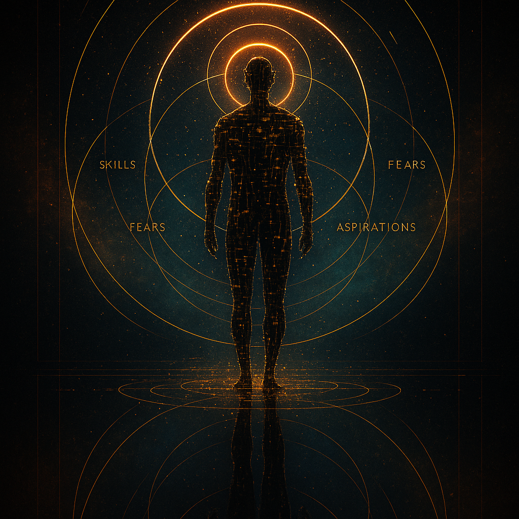 A lone silhouette figure, rendered as an intricate web of luminous data streams and abstract geometric fragments, stands within a vertically symmetrical, reflective space, encircled by radiant halos and interlocking circles, subtly revealing quantified attributes of skills, fears, and aspirations, a mystical representation of a human being as a calculable information set, Digital Art with a Surrealist, Abstract Geometric, Ethereal style, featuring dominant colors Gold, Burnt Orange, Deep Black, Cyan Mist, Crimson, with recurring motifs of Circles and Halos, Vertical Symmetry, Reflections, Mysticism, Silhouettes.