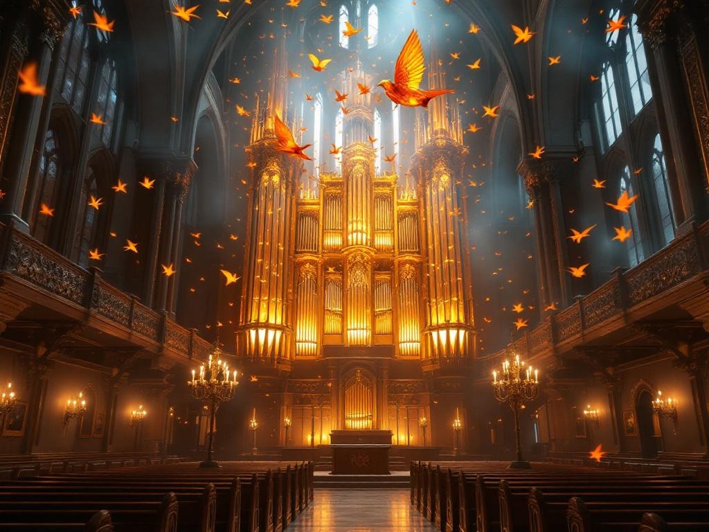 A grand Gothic organ whose towering pipes are made of translucent apricot wax, and every note releases flocks of tiny orange glass swallows that spiral through the vaulted ceiling, candle smoke, carved choir stalls, cinematic realism, 8k