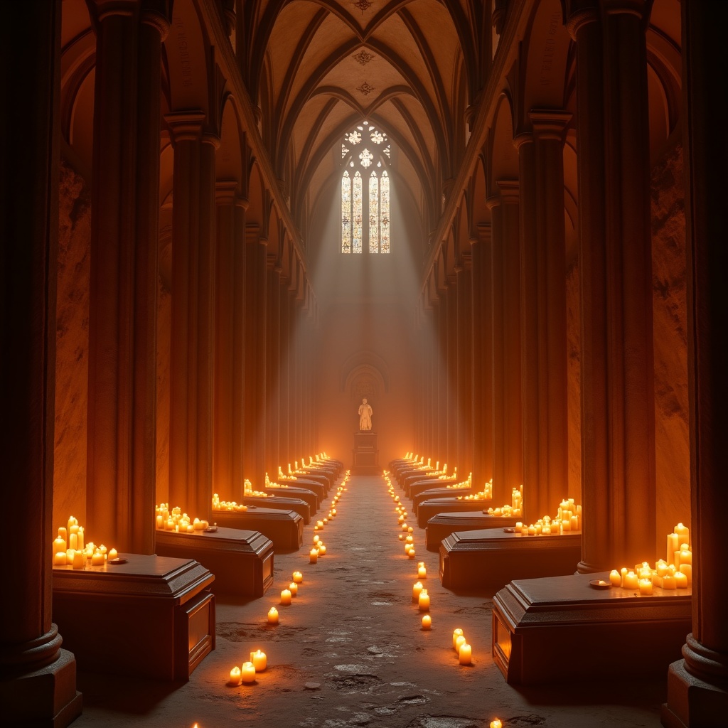 A Gothic crypt carved deep beneath a cathedral, rows of tombs lit by suspended mandarin halos instead of candles, pale apricot mist around the statues, deep burnt orange shadows between columns, ceremonial stillness, hyper detailed, museum like lighting, 8k
