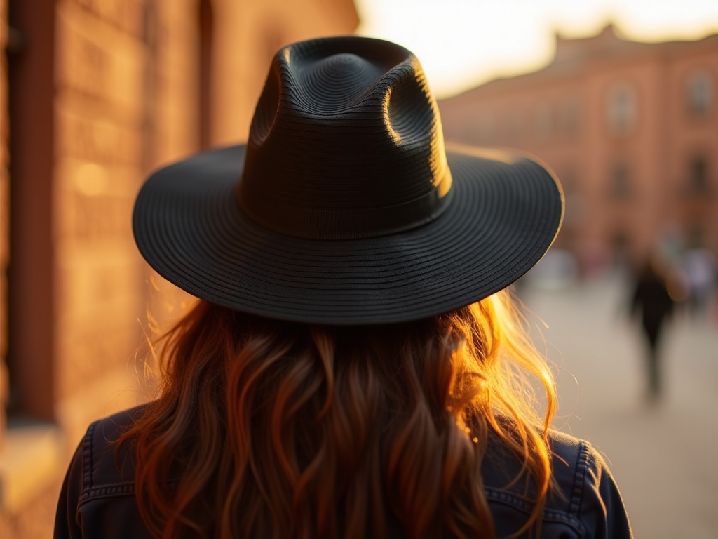 A woman seen from behind wearing a wide brim black woven sun hat and a dark jacket, her long wavy brown hair falling over her shoulders, warm golden afternoon sunlight catching the hat edge and hair, the background softly blurred showing warm sandstone architecture, candid street portrait photography, shallow depth of field, 8k