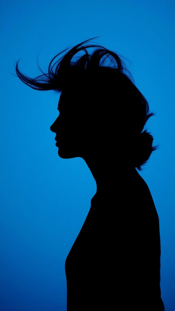 Side profile silhouette of a woman against a pure electric blue background, hair lifted by strong wind, deep shadowed figure, minimal graphic portrait, striking contemporary editorial simplicity