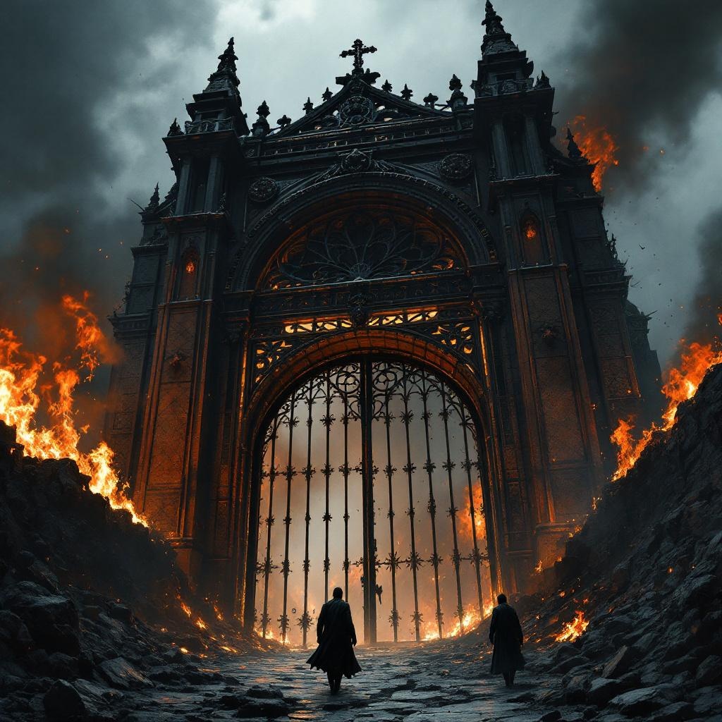 A monumental gothic gate half-buried in ash, deep brown flames glowing behind its iron tracery, ancient infernal empire mood, epic atmospheric realism