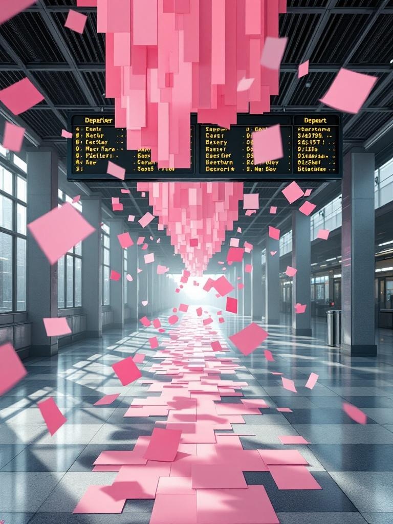 A contemporary train station where the departure board dissolves into hovering strips of pastel light pink paper, classic pink rose digits drifting through the air, cheeky pink shadows across the polished floor, grounded urban surrealism