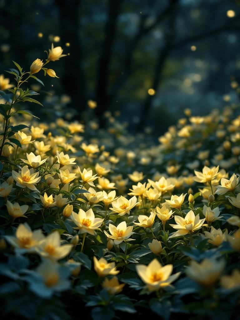 A night garden overflowing with pale yellow moonflowers and soft yellow leaves, dense blossoms covering almost the entire ground plane, cool night air, silvery highlights, deep botanical depth, atmospheric realism, 8k