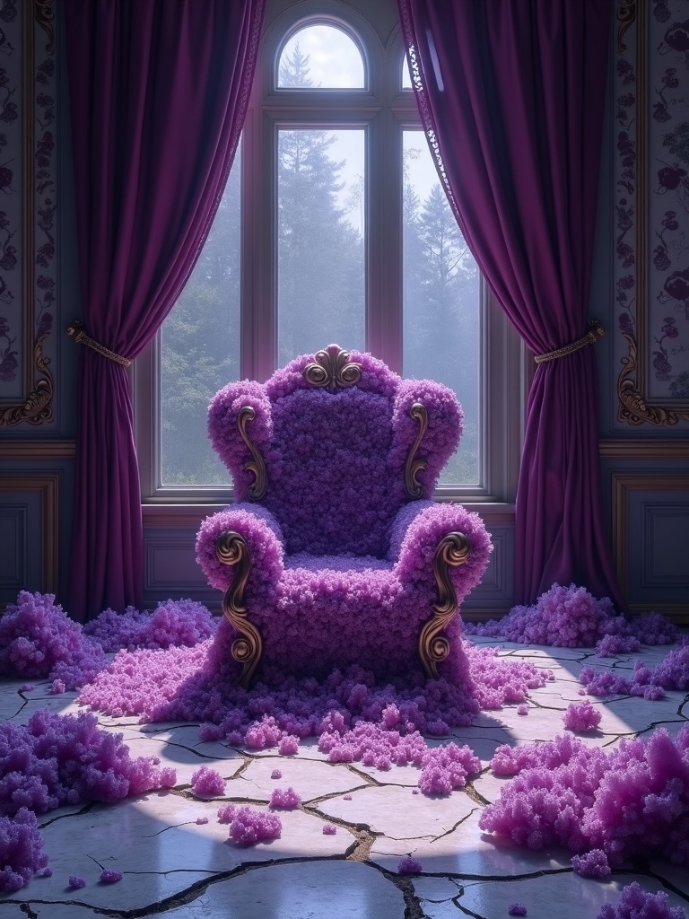 An abandoned royal throne room where everything has been overtaken by growing amethyst crystals, the throne itself encased in violet mineral formations, cracked marble floor with purple veins of crystal pushing through, tattered velvet curtains in deep plum, moonlight streaming through shattered rose windows casting lavender patterns on the walls, dust floating in the light, grand scale, atmospheric decay photography