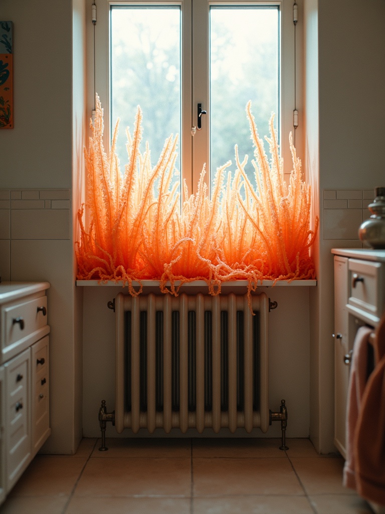 A small apartment radiator transforming into a living coral reef of peach orange fins, apricot glass anemones, and slow curling steam fronds, socks drying nearby, tiled wall, everyday interior turned impossible, highly detailed, soft morning light, 8k