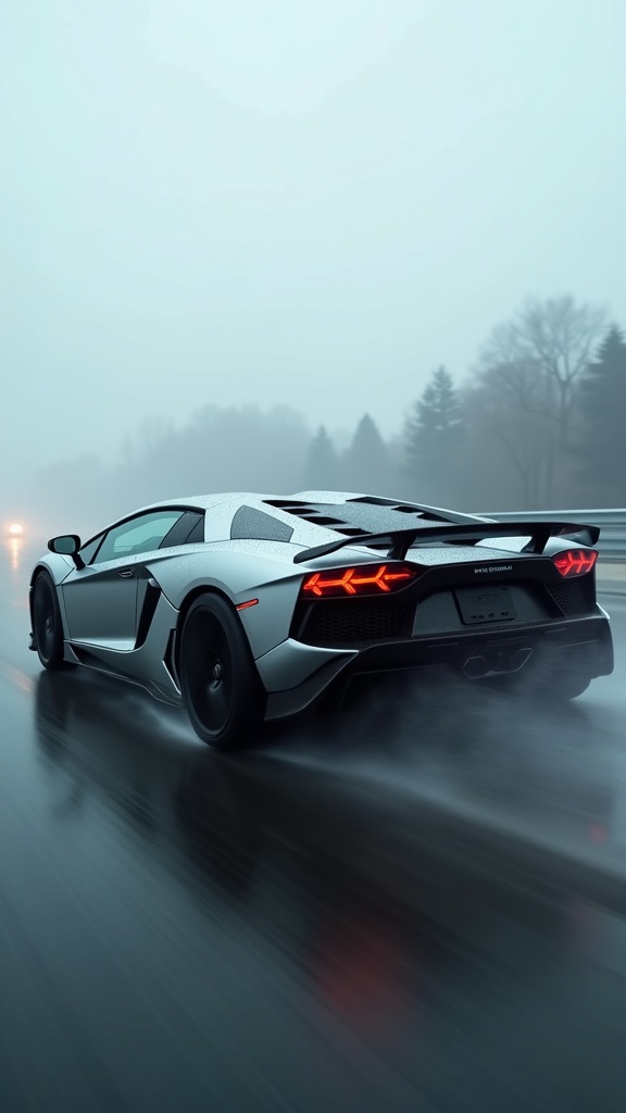 A sleek silver supercar shot from a low side angle at high speed on a dark wet road, motion blur on the wheels and background, the metallic body reflecting the grey overcast sky, water spray from the rear tires, the sense of raw velocity and power, the car sharp and the world blurred around it, automotive photography, cinematic, 8k