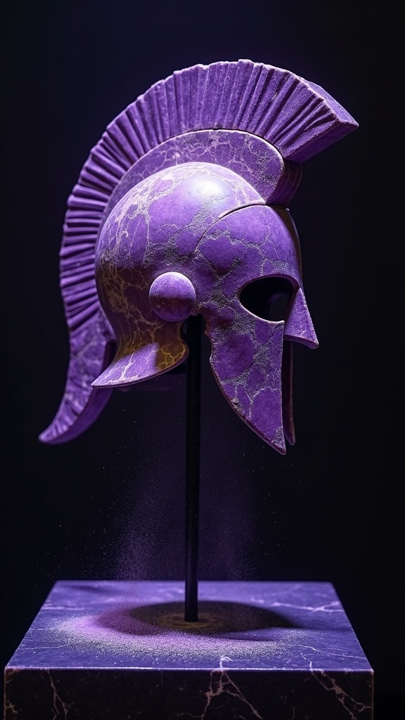 An ancient Greek helmet displayed like a relic, its cracked marble crest breaking into lilac holographic grids and violet scan lines, silver dust in the air, deep plum shadows below, moody gallery lighting, sharp focus