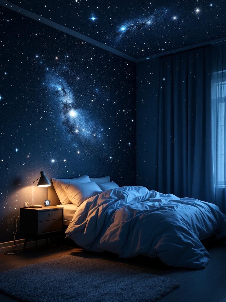 A bedroom where the walls and ceiling have dissolved into deep space — the bed floating among stars and distant galaxies in deep navy and midnight blue, bedside table lamp still plugged in and glowing warm, an alarm clock showing 3AM, cozy blankets against infinite cold cosmos, intimate versus infinite, 8k