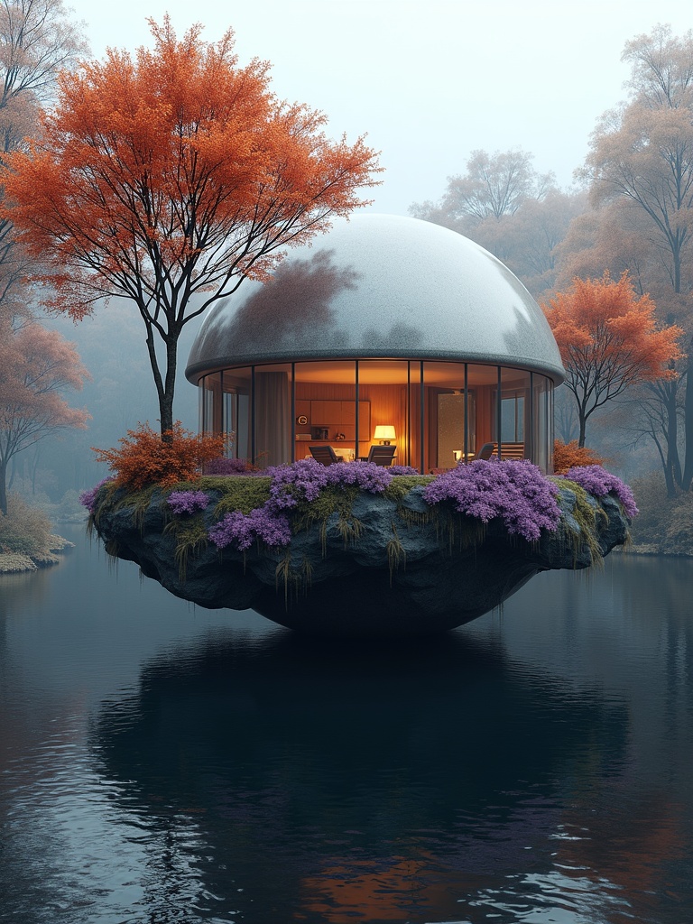 A futuristic house enclosed inside a floating biosphere overgrown with autumn copper trees and violet moss, dark reflective water below, premium eco-architecture concept art