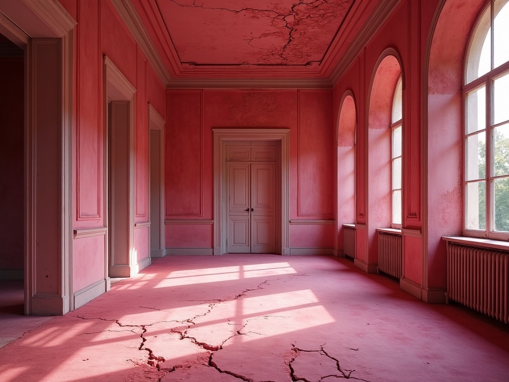 An abandoned opera foyer with faded classic pink rose velvet, cracked authentic pink plaster, hibiscus pink dust glowing in the air, decay rendered as quiet luxury