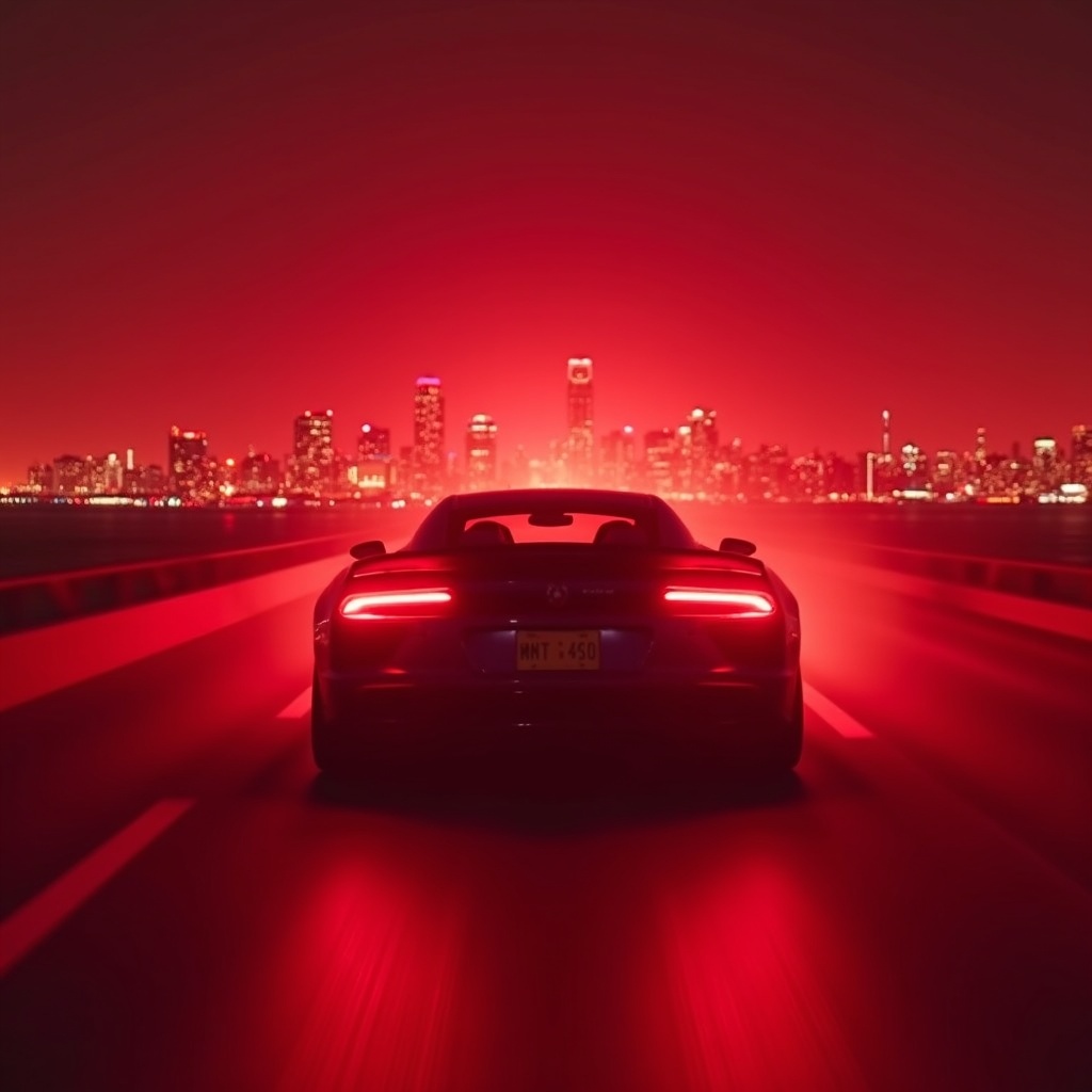 Cinematic short-form video frame of a sports car driving fast toward a distant city at night, centered rear composition, glowing road reflections, subtle motion streaks, atmospheric haze, stylish modern energy, the entire scene unified in a red palette with crimson skyline bloom, ruby taillights, burgundy road shadows, and soft red neon diffusion, premium synthwave-meets-luxury mood, highly aesthetic, clean and bold, no blue, green, or purple contamination