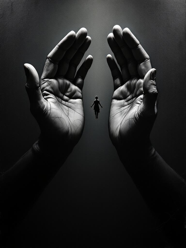 Dark baroque oil painting of two monumental sculptural hands almost touching while a tiny human figure drifts between them, deep chiaroscuro, cracked plaster texture, sacred tension, old master mood