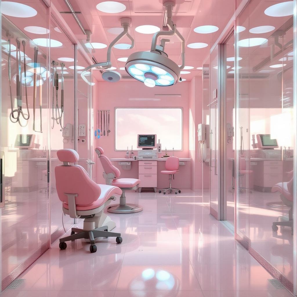 A surgical theater where every metal surface has turned into translucent blush glass, pastel light pink partitions, cheeky pink instruments resting in impossible liquid reflections, sterile and dreamlike