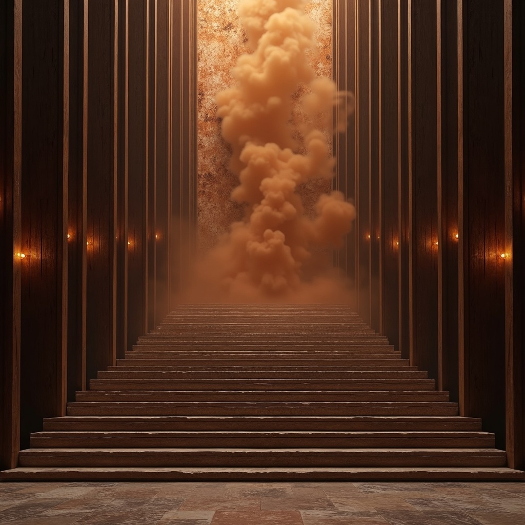 A grand staircase made from layered dark wood and ember-colored stone, faint brown smoke rising between the steps, palace-scale hero composition