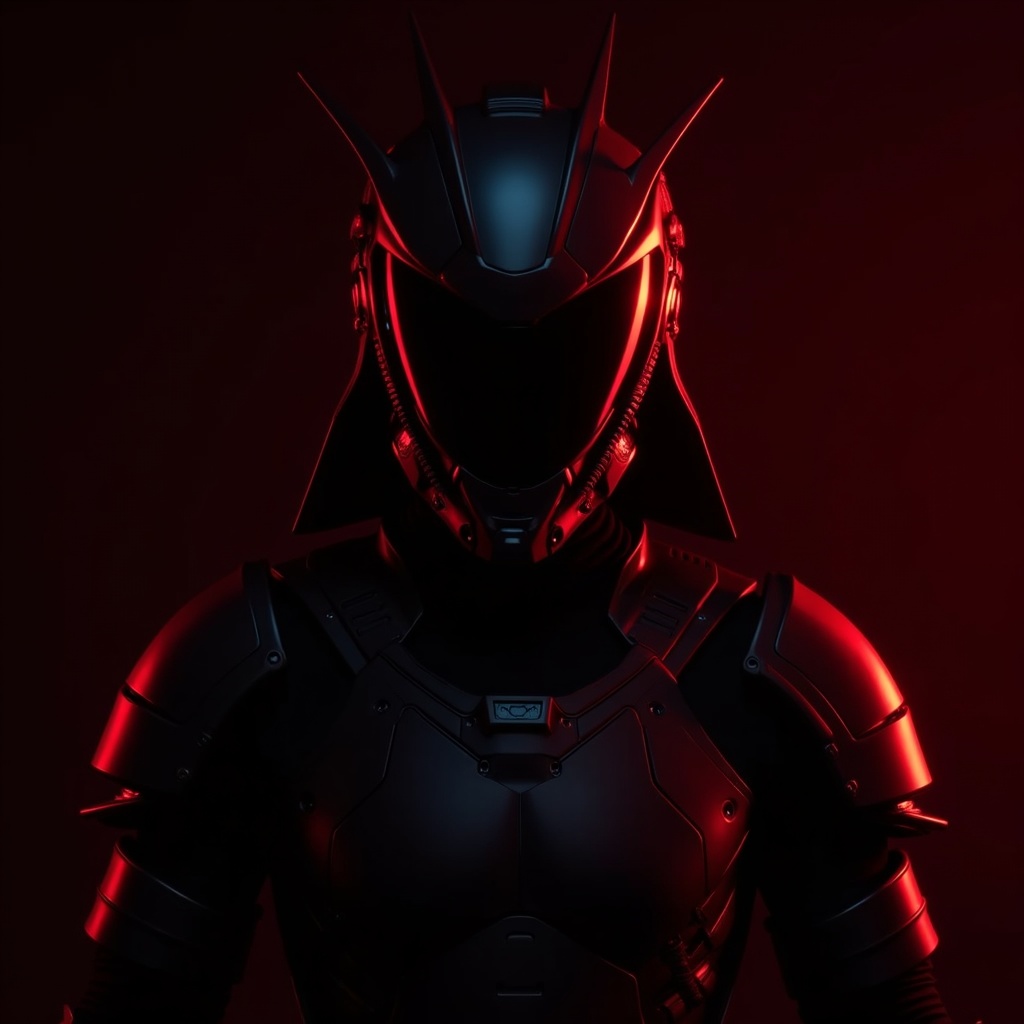 Ultra-cinematic portrait of a cyber samurai wearing sleek futuristic armor illuminated by deep red light, dark background, centered composition, intense gaze, glossy and matte surface contrast, elegant crimson reflections across the helmet and armor plates, premium sci-fi campaign quality, no bright blue accents